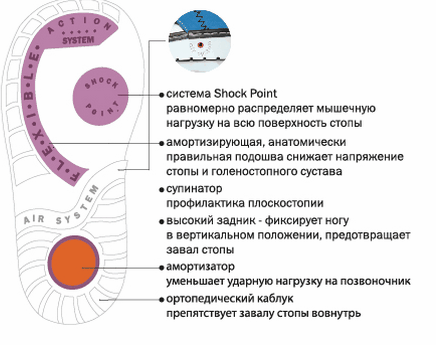 Укрепленные берцы и высокий жесткий задник позволяют надежно зафиксировать голеностоп в процессе бега и ходьбы. Каблук Томаса своей особой удлиненной формой края обеспечивает правильное развитие мышц и уменьшает нагрузку на продольный свод стопы, не давая ноге заваливаться внутрь. Супинатор предотвращает развитие плоскостопия, а передняя часть подошвы каждой модели снабжена специальной системой амортизации Shock Point. Она позволяет равномерно распределять давление по всей стопе, снижая нагрузку на позвоночник.