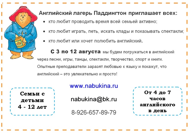 Где учить английский? (курсы, язык. школы, НЕчастные лица)Приглашаем в веселый и очень английский семейный лагерь - на закрытой территории базы отдыха Надеждино во Владимирской области мы будем вместе играть в английский. Контакты: