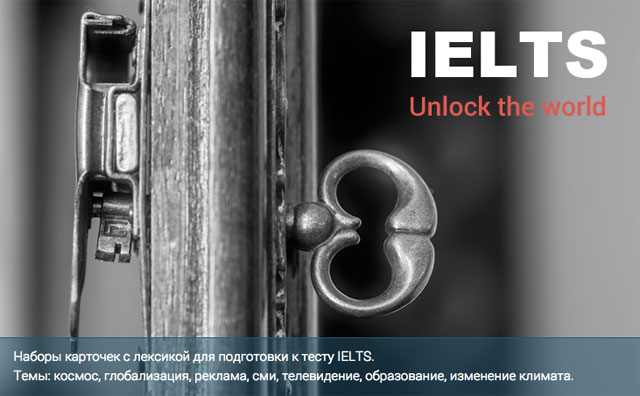 Как обещала, выкладываю vocabulary для подготовки к IELTS. Охвачены темы (космос, глобализация, реклама, сми, телевидение, образование, изменение климата). Наборы карточек cо словами и фразами подготовлены преподавателем, которая успешно готовит к сдаче IELTS уже более 10 лет. Мне помогло. За полгода подняла балл с 6 до 7 :)