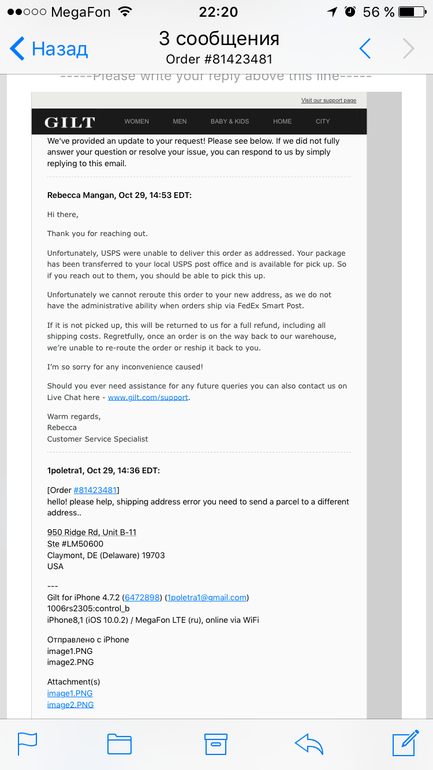 первое письмо о том, что на заявку ответят в течении 24 часов, второе о том, что они не могут перенаправить вашу посылку, вы можете забрать её в своём локальноом офисе USPS. Если вы обратитесь к ним, то сможете забрать её. Если вы её не востребуете, то она вернётся в магазин для полного возврата, включая расходы на доставку.