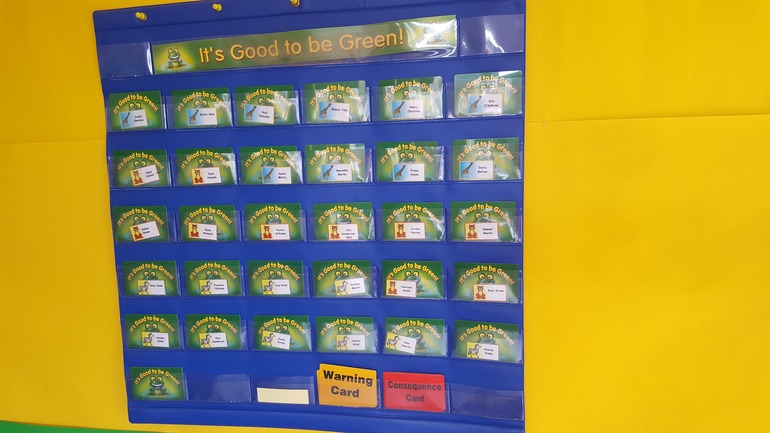 Называется it's good to be green, если проказничают, то получают желтую карточку, если 3 желтых, то это красная карточка, а с красной карточкой сажают на стульчик одного в комнате отдельной.