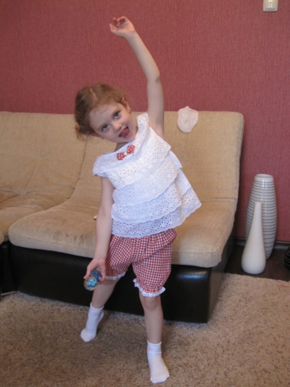 Костюмчик брала на 110, в дочке 100см Очень понравился, воздушный такой. Сначала правда шортики жесткие были, но после стирки помягчали. И да, на крупненькую девочку будет не очень, резинка тугая, я своей распарывала. Света СПАСИБО!!!!