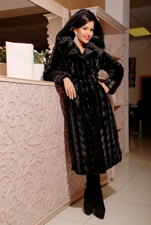 5300 руб Роскошная классическая длинная шуба из норки (иск) с поясом. Капюшон не отстегивается. С утеплителем. Мех не требует специального ухода.