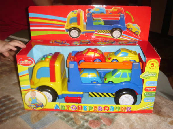 Потом увидел еще коробку и полез ее распоковывать, а там.....еще машинка,да не одна а целых 5!!! Кстати благодаяря им,мы уже выучили 2 цвета)