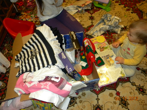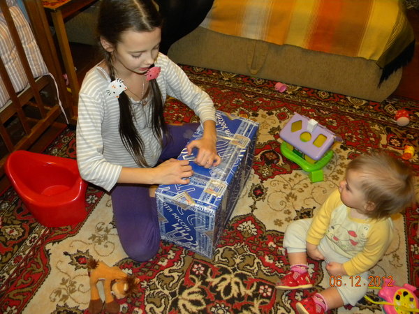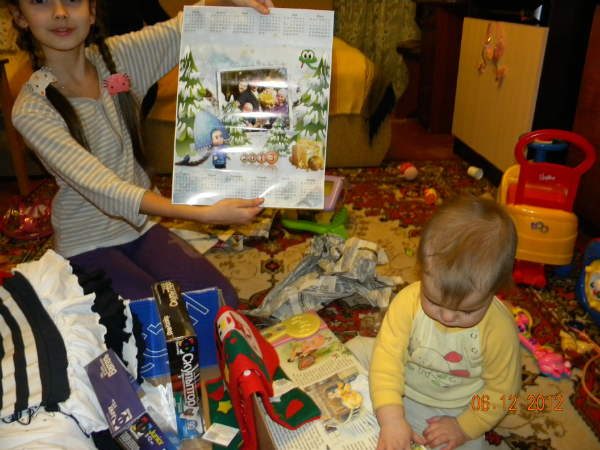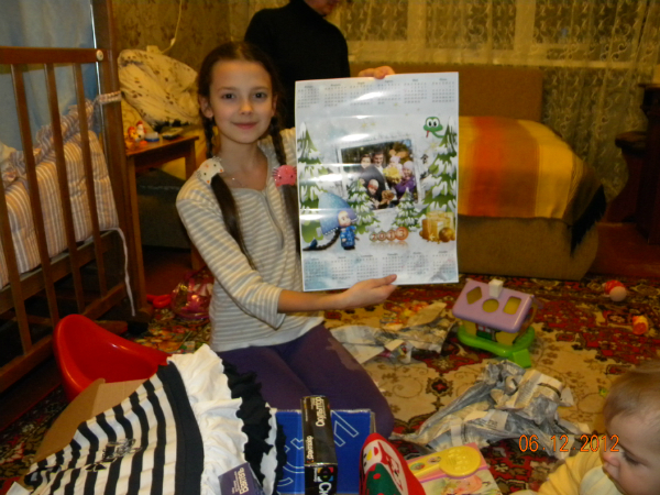Сначала Ева не поняла что за фея, объяснила что типа снегурочки))) потом открывали коробку и только ахали. Еве платье и майку модные, Симе водолазку и костюмчик на лето в белом цвете, два набора для творчества, Симе книжка музыкальная ( полвечера под нее танцевала), два носочка для Новогодних подарков (Ева впечатлена), и вкусные восточные сладости -всем понравилось оччень. Наша феячка такая умница, такое письмо написала, что старший ребенок действительно поверил в чудо ( вот что значит талант к сочинительству), и календарь , где запечатлена вся наша семья займет почетное место на кухне, т.к. это место где все собираются за общим столом и всем всегда его будет видно.А Серафима хоть и маленькая, но её очень понравился сам факт открытия коробки и она активно все доставал от туда))) В общем спасибо тебе наша феечка, очень все понравилось, ты просто настоящая фея, которая творит чудеса!!!!!