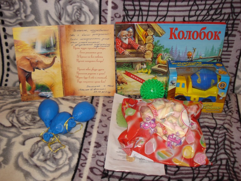 Даже рукодельный, очень полезный подарок в нашей посылочке оказался очень неожиданным - 3 синих шарика заполнены разными по размеру мелкими предметами, для развития тактильных ощущений).