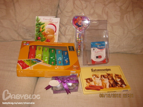 Благодарность фееВ субботу к нам пришла посылочка от нашей феечки. Так как мы сразу уехали на дачу,то подарки посмотрели только сейчас. Очень все понравилось,детки были в восторге,да и мы с мужем тоже. Единственно не подписанна новогодняя открытка,я даже незнаю кого поблагодарить. Светуль нужна твоя помощь)))