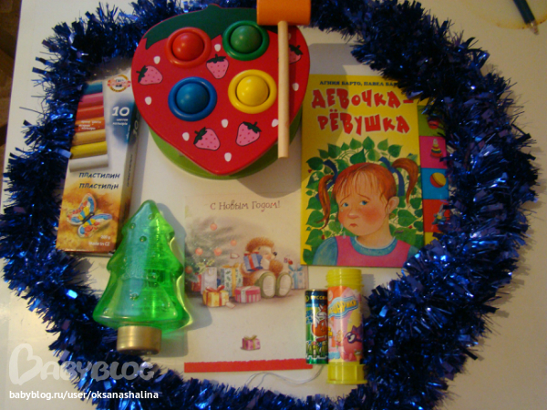 а это весь наш подарок - мешура, пластилин, пена для ванны, открытка с очень добрым пожеланием, хлопушка (которую я припрятала пока), мыльные пузырики, книжечка, и супер игрушка!!!