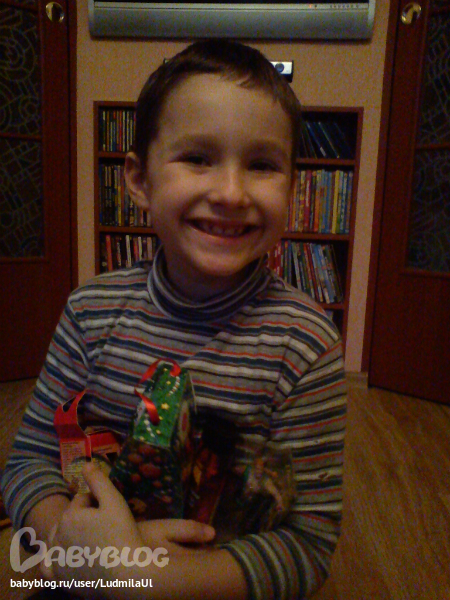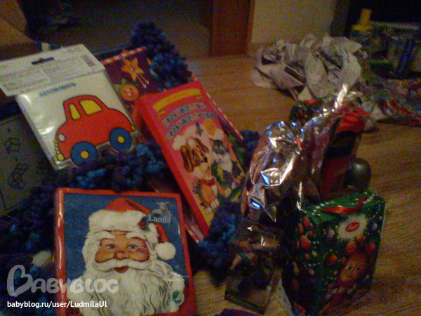 Там были еще интересные шоколадные наборчики с окошками. Весь вечер играли - называешь номерок, открываешь окошко, там малюсенькая шоколадная капелька. Вытаскиваешь, а на обратной стороне оттисненный рисунок. Еще косметический набор из шампуня и жидкого мыла. 3 конфетных набора "Маша и медведь". Книжки, духи, дезодорант папе.... Никого не забыли!!!