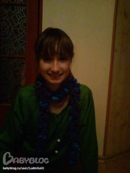 Аленка примерила на себя чудесный, каким-то неведомым мне образом, сплетенный шарфик. Теперь ломает голову, какой бы придумать костюм на новогодний карнавал, чтобы он вписался.