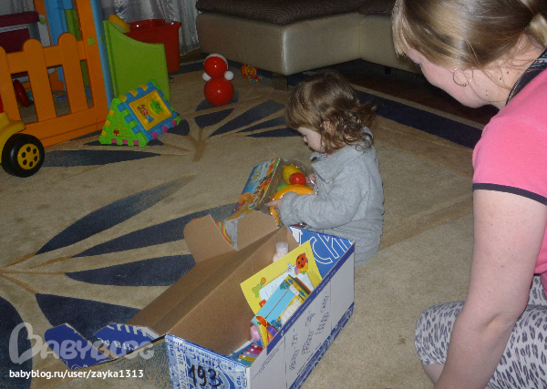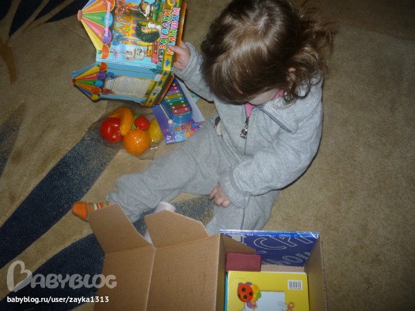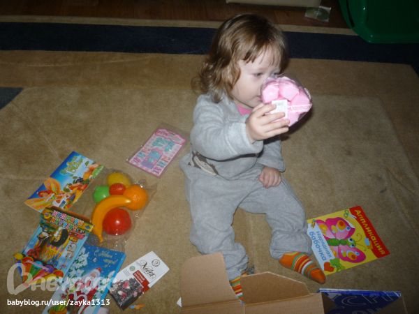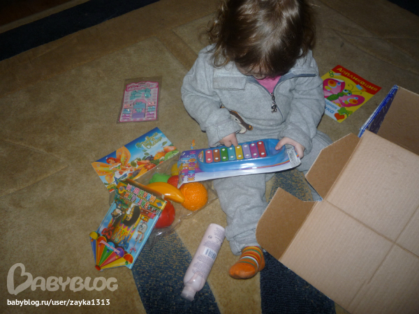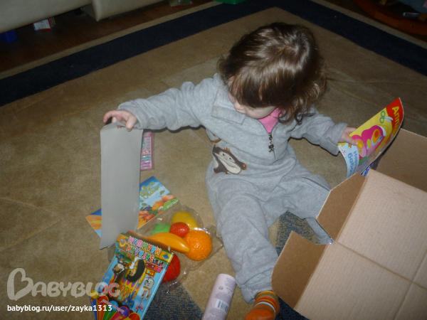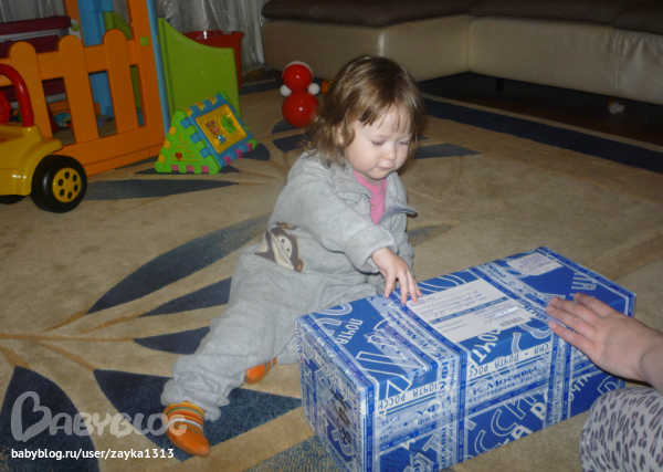 Sveta ))))). Я так сначала сопротивлялась Свете, не хотела знать почтовый идентификатор, чтоб сюрприз был, а потом все-таки сдалась, и не зря!!!! Еще не известно сколько бы я ждала извещения, скорее всего до окончания наших жуткий морозов)))). И вот сегодня сгоняла на почту и истребовала с них мою посылку)))). Вот она наша синяя "калёбка", как назвала ее Варюшка. Мама помогла вскрыть, а Варя по-хозяйски взялась за разбор посылки!))).