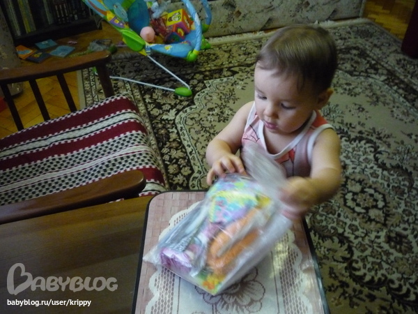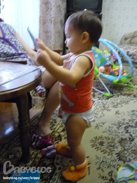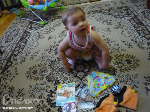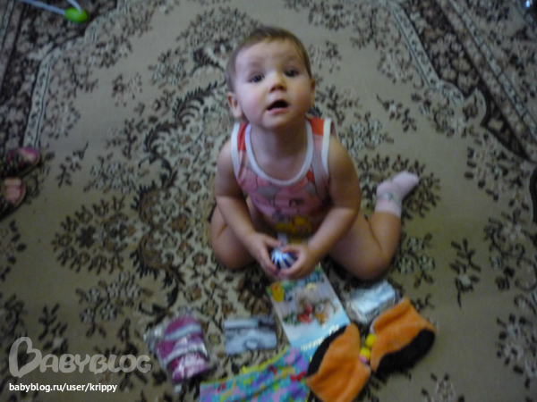 Я Ане так же сказала, что главное - с душой!)) А тапочки разные мы обожаем, мама с папой свои не дают трогать, так что вчера она нарядилась в свои новые, на руку как сумочку одела трусики и давай бегать по квартире