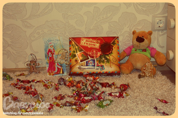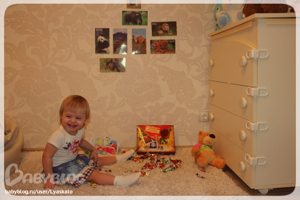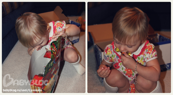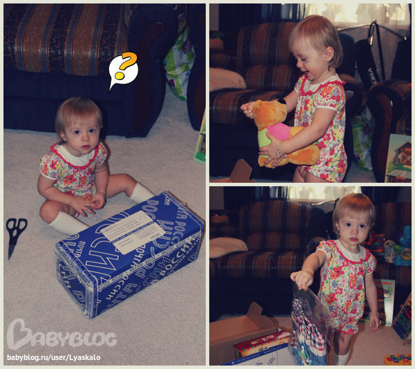 Вот Алиса получила посылочку и помогала маме ее открывать, ну а подарки все сама вытаскивала) Показывала мне)))