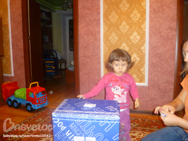 На улице метель, ветрище, снег - а я бегу на почту с извещением))) Коробка большуууущая, в предвкушении бегу домой))) Открыла и была в шоке - не думала чтопридет такой шикарный подарок, так много всего, у Милнки глаза рзбегаются, она как и япросто в шоке)))