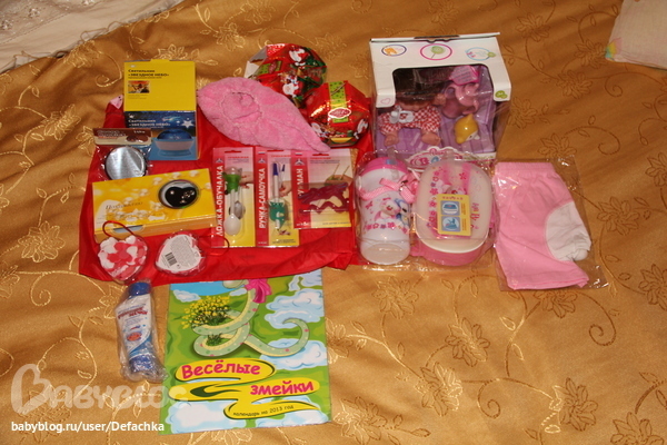 А теперь для отчета))) что же было в нашей коробочке (главное ничего не забыть): для малышки была куколка с сосочкой и бутылочкой, набор посуды, повязочка с цветком, милые штанишки с маленьким хвостиком, крем для щечек и для ручек, очень интересные самоучители (как правильно держать ложку, ручку и палочки (я такие даже не видела, каждый из взрослых уже испробывал), для старшенькой была сумочка с: носочками-топотушками (сразу же надела и носит теперь каждый день), зеркальце, светильничек, мыло для ванны и набор с жемчужиной (дочке оооочень понравилось, сразу же достали, попалась нежно-розовая жемчужина, которую уже вставили в кулон и теперь висит на ее шейке), а еще конфетки, календарь и открыточка с символом года! Надеюсь, что ничего не забыла)))