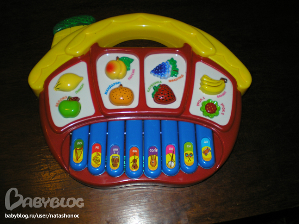 Суперское пианинко.Там и названия фруктов говорят,и можно ноты включить,а можно музыку.А музыка из мультиков,дети любят под них плясать.