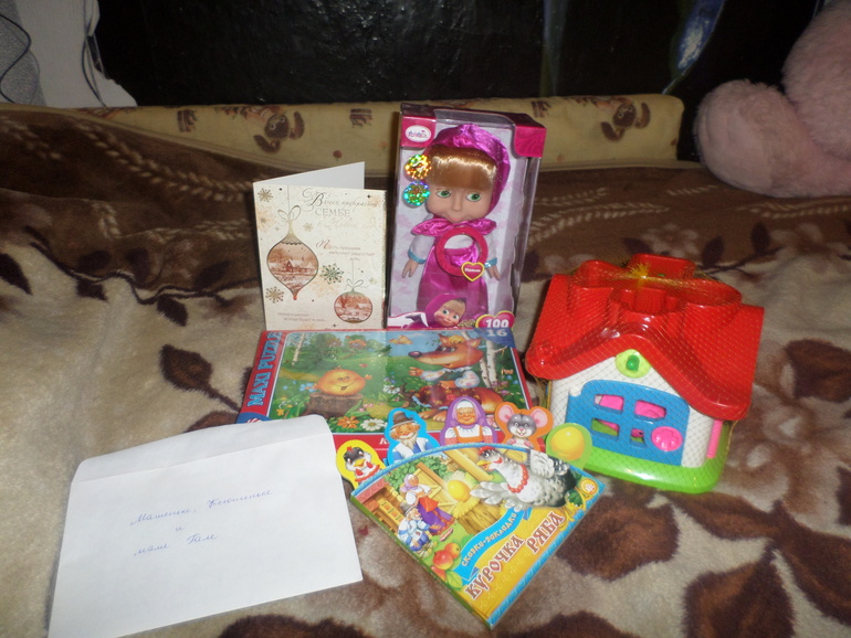 подарочки просто супер..а ккое душевное письмо пришло...очень красиво написанно...мы как раз вчера нарядили елочку и часть подарочков я спрятала туда-дети были в восторге...а говорливую Машеньку оставили до 31 числа)))..положу ночью от Феечки))..домиком играем 2 день...при чем всей семьей))...интересно же как игрушки туда падают)))..спасибо большое наша феечка-нам оочень приятно внимание.ну а теперь фото