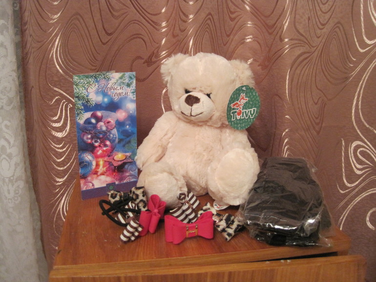 Благодарность фееПолучили мы праздничную посылочку от Вовы и Андрея (На посылке адрес: г. Долгопрудный Ковалевская Ирина Александровна). А там красота-красота: заколочки для Лизоньки, теплые перчатки для родителей и чудный мишка. Перчатки пришлись как раз по размеру, а мишка - он такой милый, мы взяли его с собою спать)))