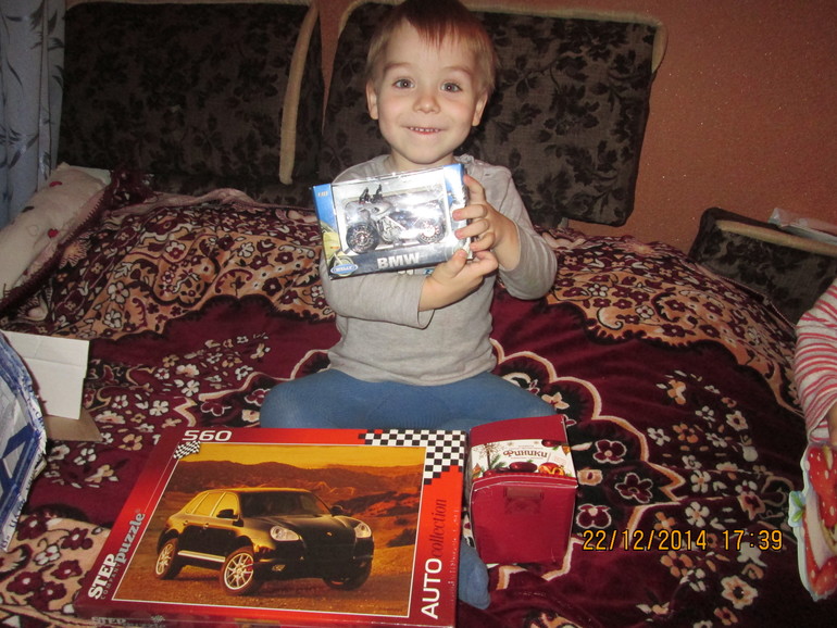 Малыш немог усидеть на месте и очень торопился ее открыть. В нутри его ожидал сюрприз от нашей феечки Лены Елена его любимая игрушка мотоцыкл
