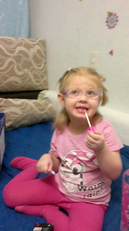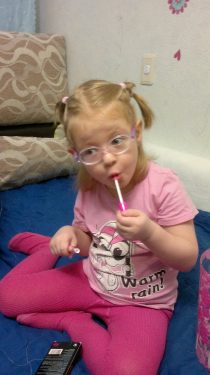 А потом мы достали такое чудо, Большущую банку с украшениями, расческами и помадой! О сказка!!! Как же Дашутка это любит... Даша и расчесалась, много много раз, и заколочки-резиночки примерили, а помада... не знала что моя дочь так здорово умеет! красить губы