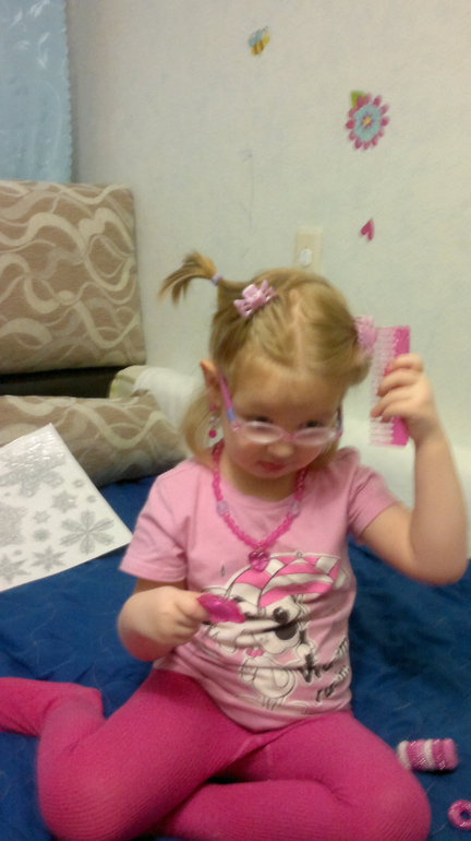 А бусы и клипсы!!! надо сразу примерить, и полюбоваться в чудесное зеркальце! Какая же красавица, принцесса! нанана!!! Какая же прелесть теперь у нас есть, а в банку теперь сложили все резиночки, раньше голову ломала где хранить. (убирать банку никуда нельзя, даже на полку, она только сама! это только ее!!!)