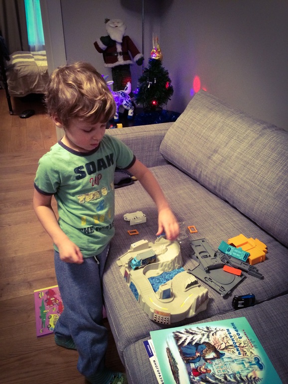 А еще была пара игрушек. Дед Мороз в дороге разбился;-( мы его быстренько ликвидировали, пока Мишка ничего не просек. А вот снеговик со сладким сюрпризом ждет своего часа. Покажу после ужина;-) такая я мама. Не все сразу.