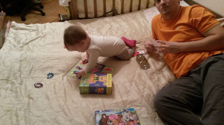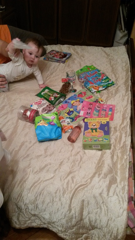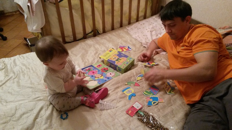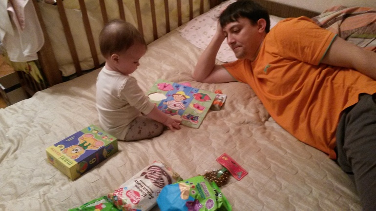 Пазлы Дарюшке очень понравились на зуб, а от деревянной игрушки переодеть мальчика Даша зависла минут на 30 и поверьте это дорогого стоит!!!! Мигающая елочка тоже впору пришлась по нашим зубам))))