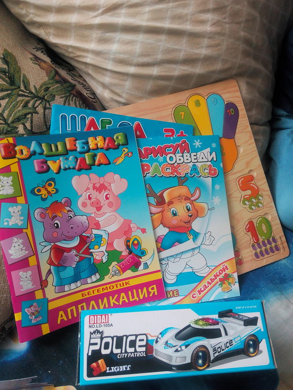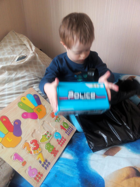 Развивающая игрушка- вкладыши с цифрами и ладошками -Антон сразу с ней занялся! Домашние задания, которые также позволят нам с Антоном и время провести вместе и развить нужные навыки- аппликация, раскраска, и развивающая книга! Ну и полицейская машина- мне кажется, это вообще мечта всех мальчишек!)))) И конечно, тёплые пожелания в открытке для нашей коллекции!