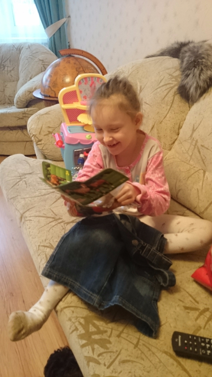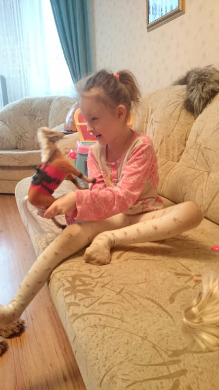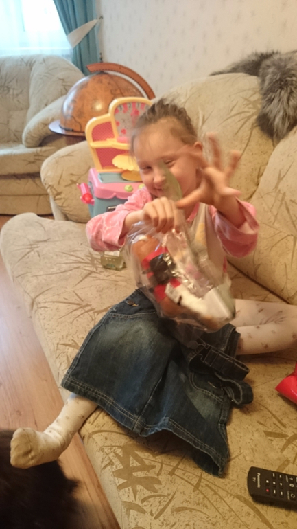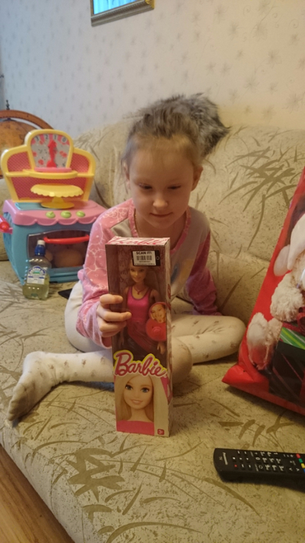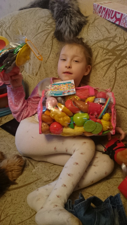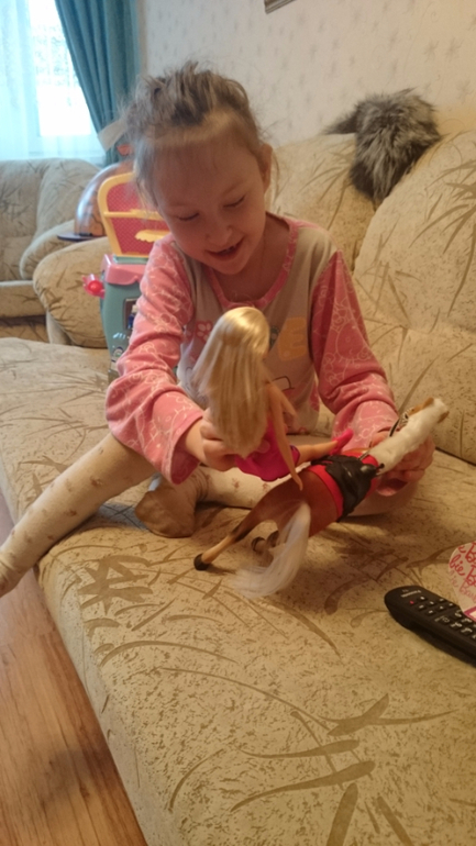 Довольная. не то слово, еле её спать положила, лошадь и барби с собой взяла, сказала с ними спать будет, а потом готовить будет, после сна)))). Там же ещё целая сумка продуктов и посудка)))).