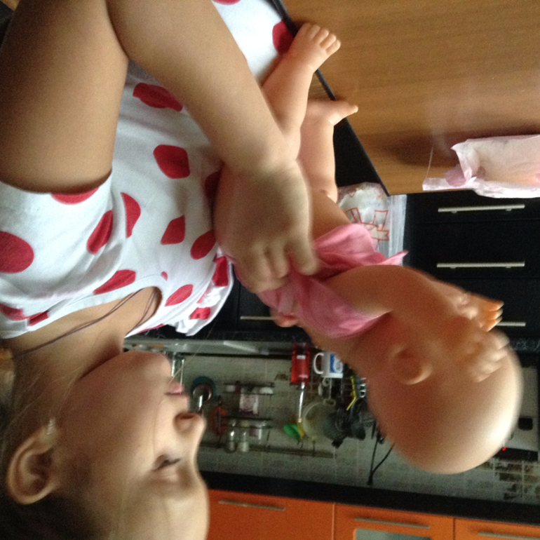 Все полотенце из ванной пошли в ход, куклу купали и мыли,вытирали .