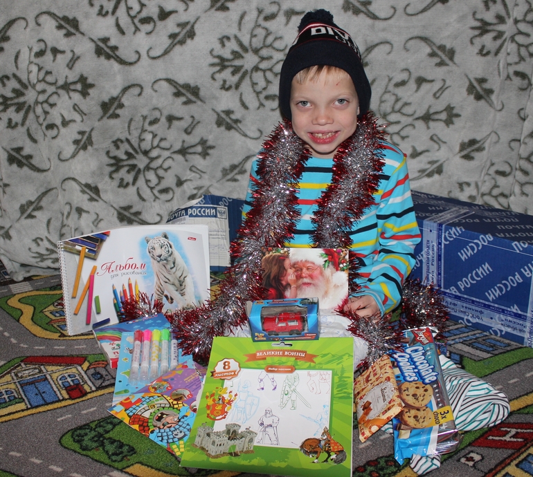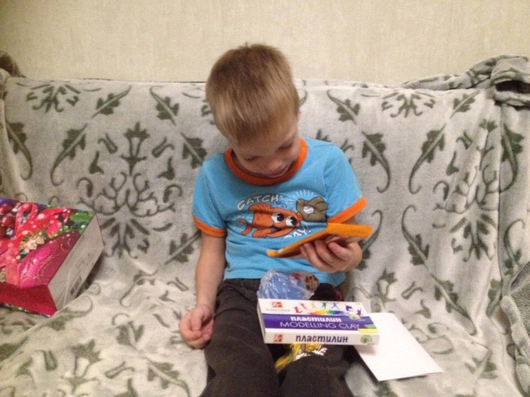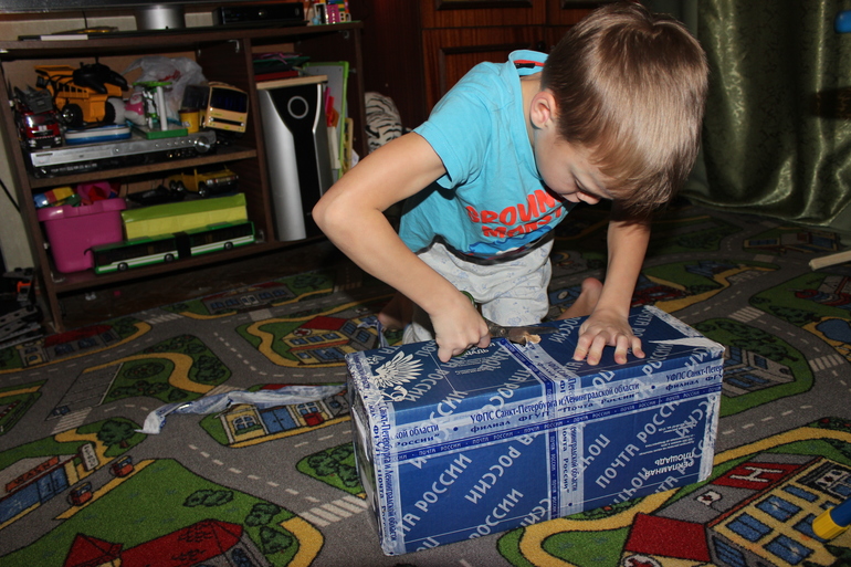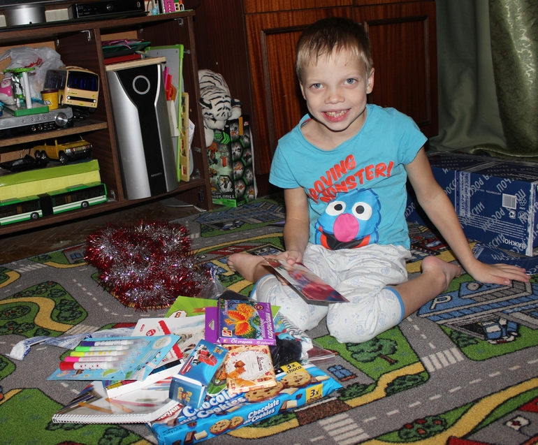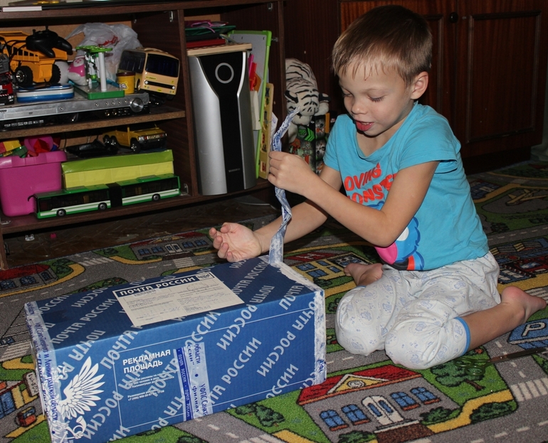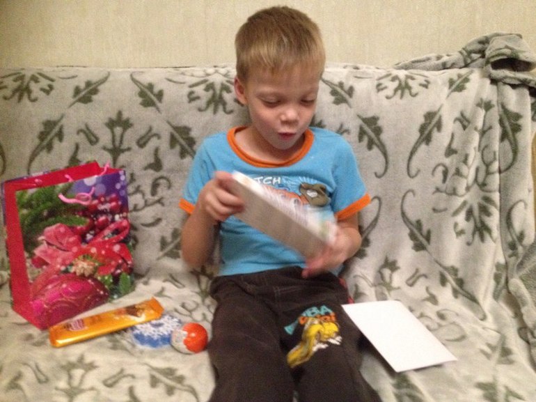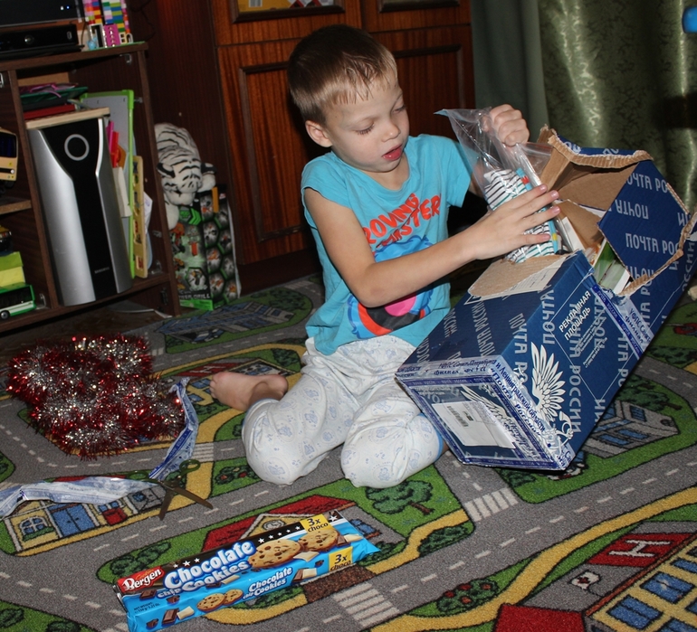 Еще мы получили посылочку от феи Анны из Санкт-Петербурга)) Как только я принесла с почты огромную коробку Алешка схватив даже не дал распаковать ее, сам взял ножницы и давай орудовать)) А там видимо невидимо сюрпризов для героя нашего и все для творчества нашего самсусам и сладости, машина и футболочки красивущие с классной шапочкой! эмоции через край конечно у нашего шилопопа!!! Огромнейшее Вам спасибо Анна за теплоту и внимание к нашему Алешке! Открыточка очень тронула и так же украшает теперь нашу ёлочку)) и даже коробку он не дал выбросить, теперь она тоже материал для творчества, Алешка режет сидит ее ножницами на полосочки, видимо задумал что то сотворить потом )))