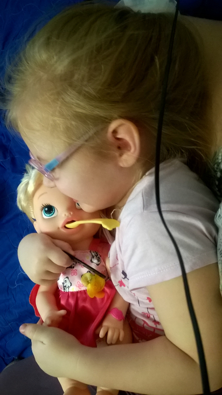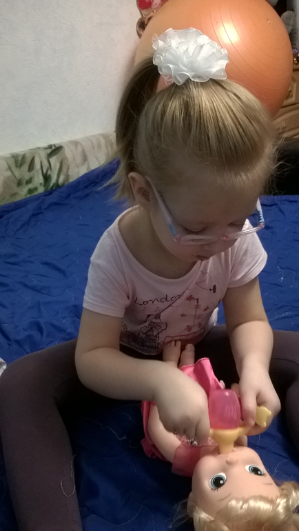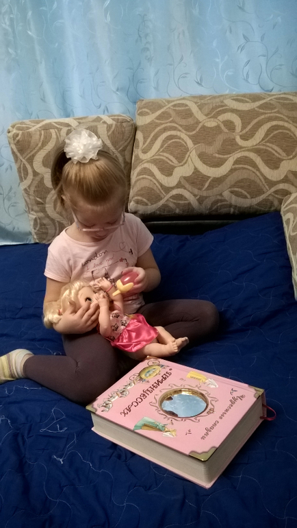 А кукла сразу стала "Моя родная доча!" вот как! Обожает ее, разговаривает, поит, кормит, спать укладывает, воркует, обнимает, целует. Я знала что дочь любит кукол, но чтобы ТАК! Настоящая мамочка! Танблшюдать за ней, как она ухаживает за своей малышкой.