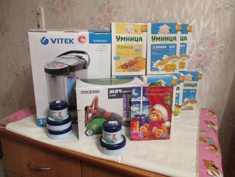 Открыл, посмотрел ..., а там и вкуснячие кашки, и мягкие крема, и упругий мячик, и кормилец (скорее поилец) термопот.