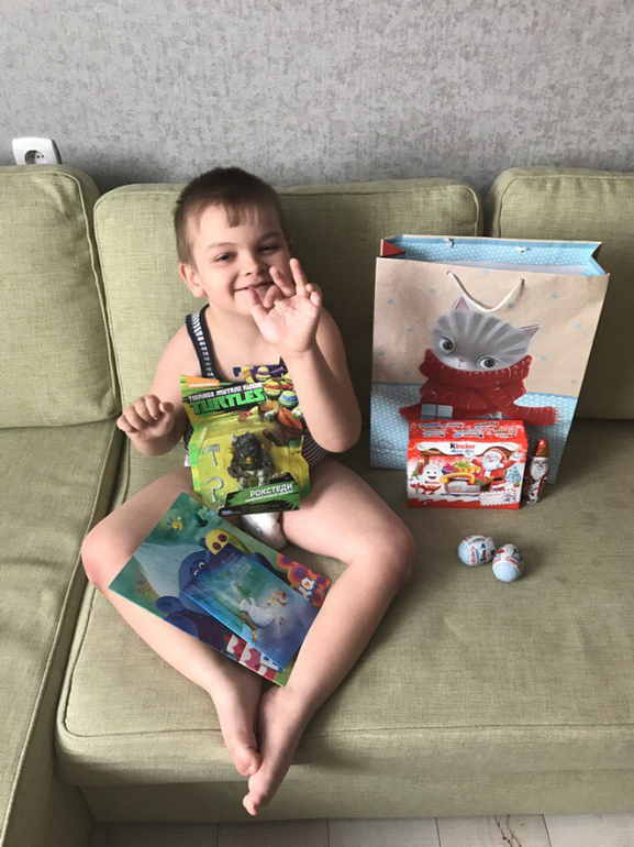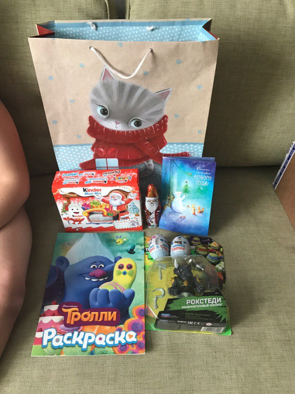 Благодарность фееНаше большое спасибо Фее Насте !!! (Оксаночка тел. в л.с. вам напишу в курьерской узнала и с феей связывалась по смс ) Еще 23 декабря мне пришло смс ждите курьера , и я не поняла какой курьер ... от куда не чего не заказывала ... ждать не чего )) ... позвонила в организацию говорят нет есть на ваш адрес заказ ждите ... и вот вечером приехали и вручили нам пакетик )) с подарками который я припрятала от Матвея до Новогоднего праздника . и вот первого числа Мотя получил подарочек и был очень рад ., ему подарили еще одну фигурку Рокстеди так еще и феечки как договорились .. фигурки разными оказались )) , Сладкий подарок от Киндер , киндер сюрпризы Матвей сразу заценил и сказал ... ОООООООО таких я еще не видел это же Совецкие )) , дедушка Мороз шоколадный , раскраска с троллями и открыточка )) Чудо новогоднее не иначе !!! Спасибо большое ! С новым годом ! Счастья и здоровья вам и вашим близким !