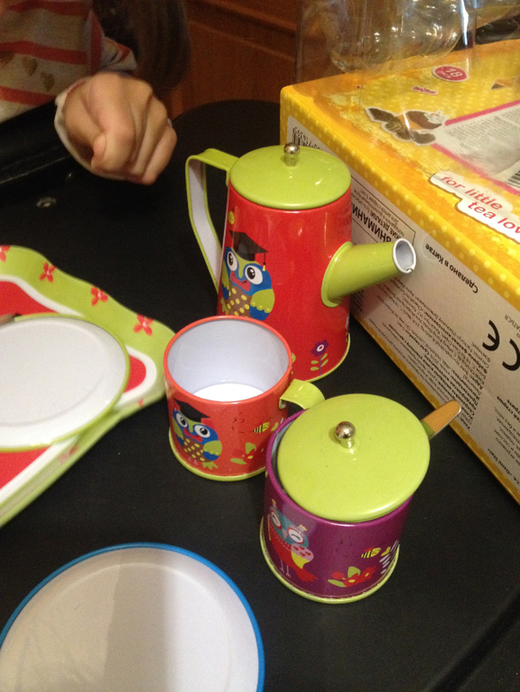 С металлическими ложечками и подносом. Все детали крупные, Анюте удобно брать за ручки, держать и наливать чай в чашечки.