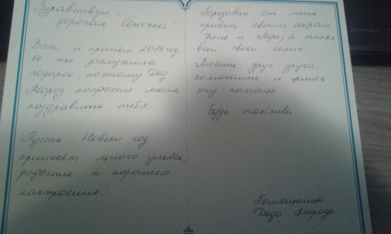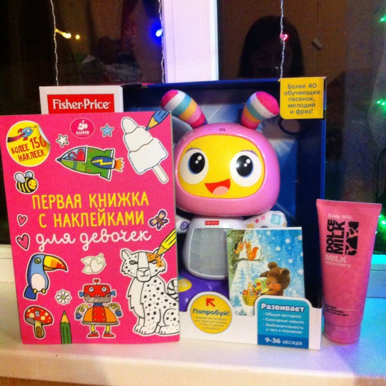 Когда дома открыли посылку и увидели подарок, то смеялись от слов почтальонов и сюрприза и у меня даже закралось сомнение насчет Снегурки))) не настоящая ли она внученька Деда Мороза?? Потому что благодаря рекламе по телевизору , робот Бибель второй год был нашим желанным подарком для деток) С роботом в посылке Лена подарила деткам книжку с наклейками , а нам замечательный очень вкуснопахнущий лосьен и открытку с трогательными и замечательными пожеланиями!