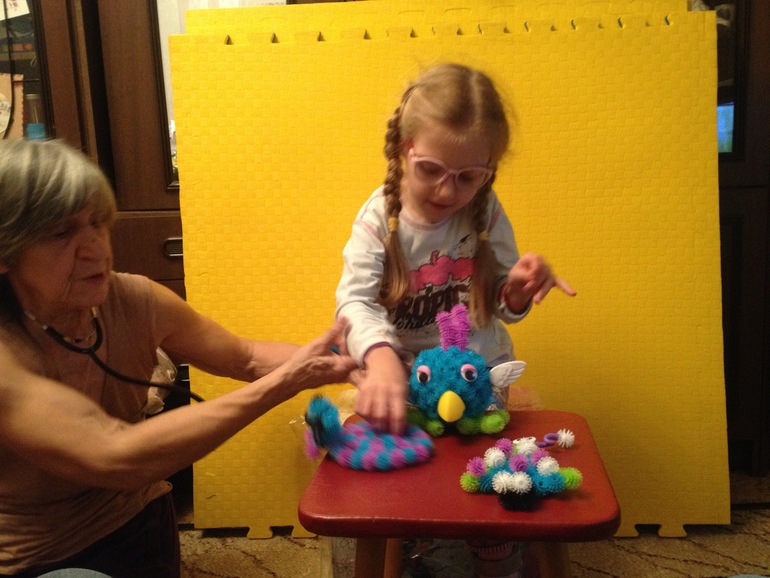 Анюта сразу полезла за Барни, всё-таки сладкое на первом месте:) а потом заинтересовалась репейником:) У нас нет такой игры дома, поэтому она не поняла, что это в коробке. А когда вытащили, то радости не было предела:) Периодически на разных занятиях дают поиграть, буквально накануне в детском саду психолог приносила поиграть. Очень классная игра. Заставляет работать пальчиками и колется в меру. Аня обожает колючки. С моей помощью сделали цыпленка голубого цвета, странного:) Точно волшебного:) Еще гусеницу с усами и ёлку с кучеряшкой на голове:) Елку не видно на фото. Цыпленок умеет бегать. На кнопочку нажимаешь, и он двигается, на батарейках. В наборе книжечка с инструкцией, как делать других зверюшек. Следующий этап-не менее волшебная сиренево-голубая собака.