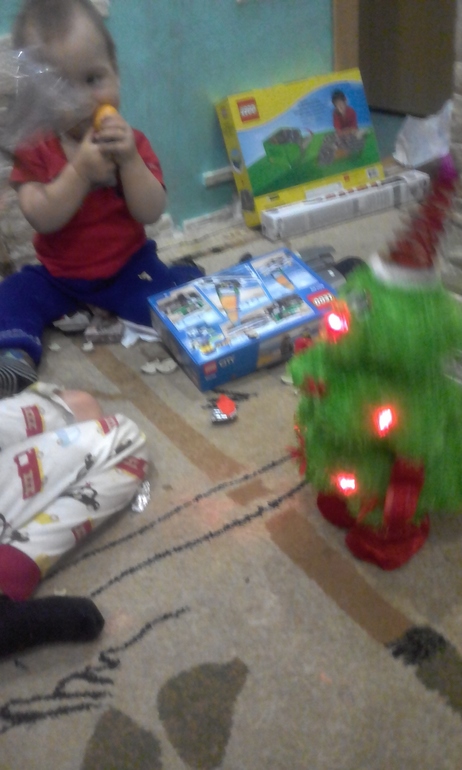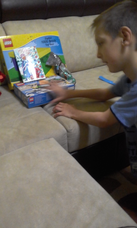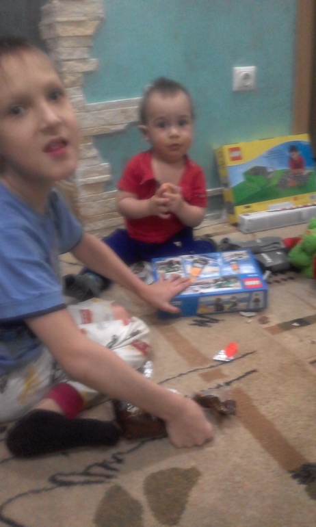 Камильчик был в небольшом шоке, сам вскрыл коробку, когда принес курьер, и просто с радустным лицом в одну минуту сьел киндер, конфетки, потом сам открыл коробки от лего, дудочку, и рад был веселой елочке, которая танцует!!!!