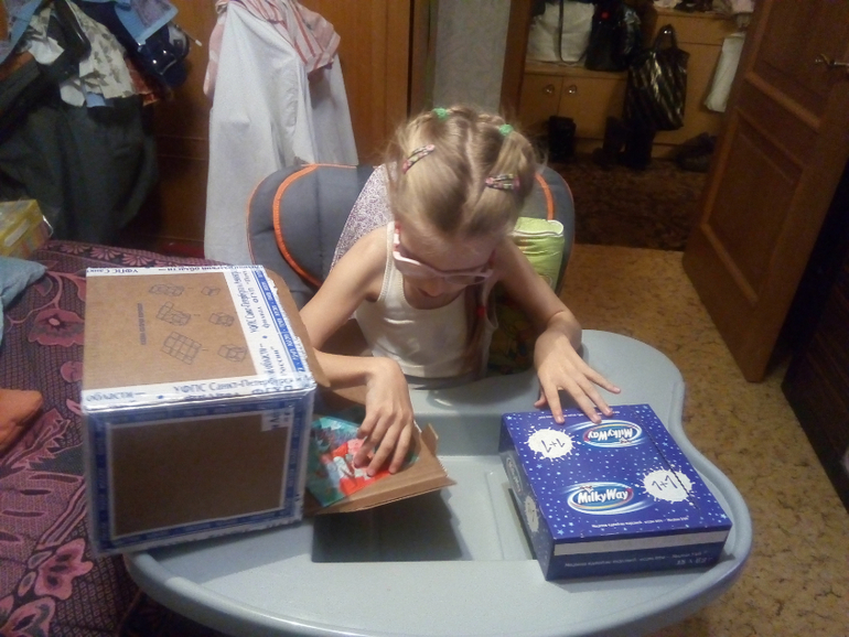 Благодарность фееПолучили посылочку от Феи Фокиной А.В. аж из Санкт-Петербурга (в открытке 2 Феи Настя и Варя) ! Феечка прислала много-много счастья! Батоники Милкивей с циферками 1+1, всё как нужно))) У Ани было столько счастья и радости при виде коробки "Ой-ой-ой, целая коробища Милкивея", как будто там не шоколадки, а грузовик черной икры)))