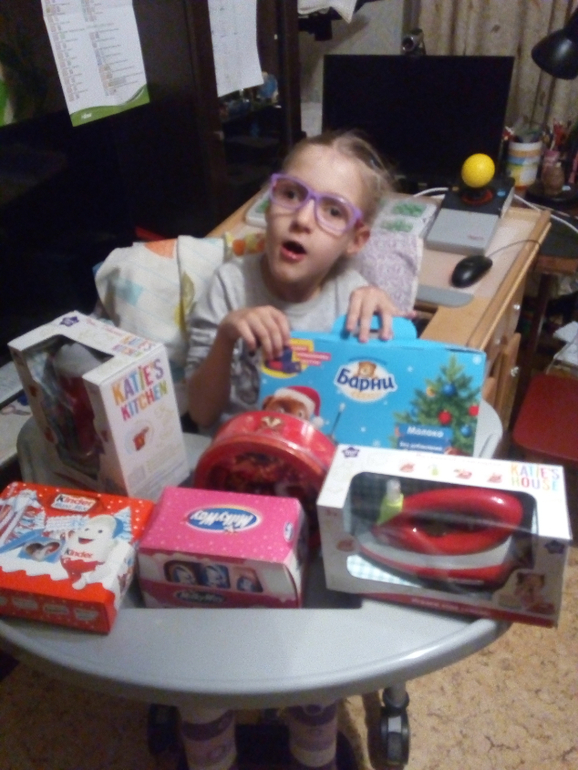 Во-первых, Аня была на уроке, когда позвонил Дедушка, пришлось отвлечься, Аня начала плакать, но поняв, кто же к ней пришел, обрадовалась очень сильно и начала свой монолог:)) "Дед Мороз, я хочу тебе рассказать..." и начала свою только что выдуманную сказку про цифры, потом вторую сказку, а потом увидела красный мешок и без стеснения потянулась за ним:)))) А там!!! Что там было!!!! Коробка Барни и следом Милкивей, в квартире стоял такой визг, и я думала, Аня выпрыгнет из своего стула, она аж на подножку сама встала)))) Как же мало нужно для счастья))) Но как ни странно, попросила вначале Барни, а потом милкивей))) Третья очередь досталась Киндеру)) а потом печенье))) Печенье кстати Аня потом отдала мне, маме))) Говорит, я не жадная, на, мама))))