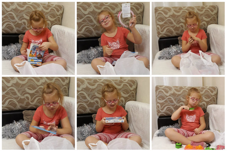 Дашутка увидела пакет, аж запрыгала от радости) А там столько чудес!!! Гирляндой дочь украсила себя сначала, потом мишку любимого, потом елочку)))А сколько чудесных украшений моей моднице)