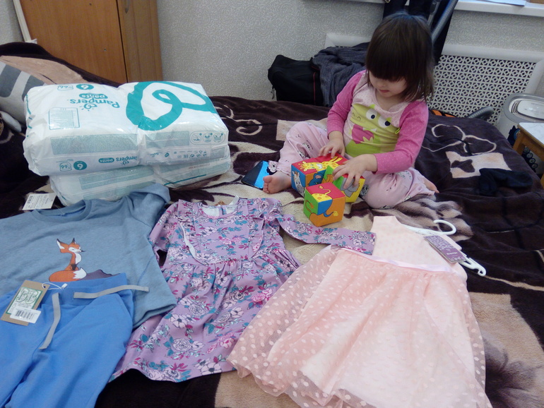 Наша фея из Москвы Скалон Ирина Владимирована прислала нам памперсы, мягкие кубики, одежду для малышей. Маша тут же начала играть кубиками.