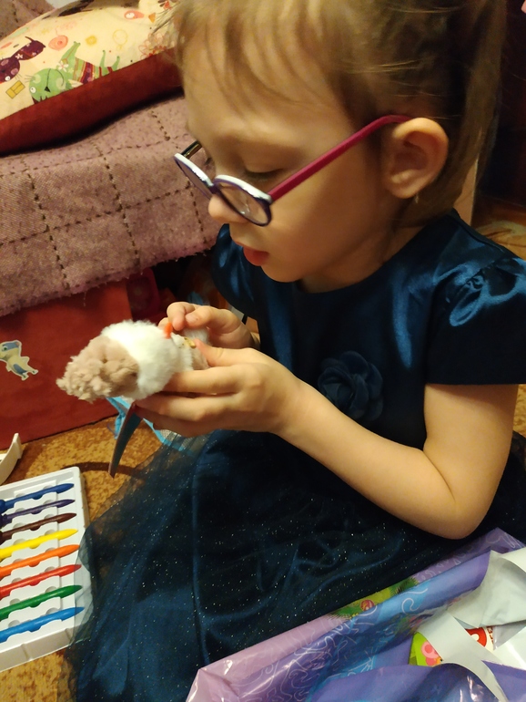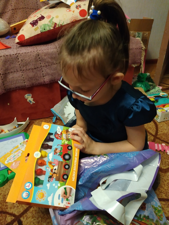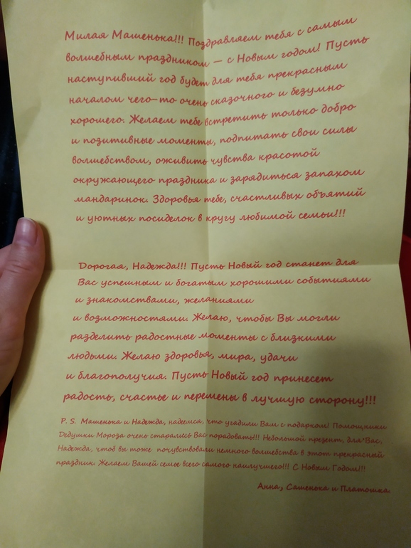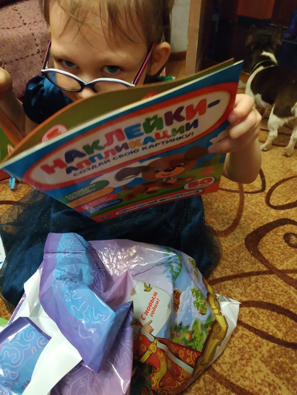 Благодарность фееВ этом году сказка пришла в наш дом. Маруся повзрослела и начала соображать понемногу, решила поставить все подарки под ёлку. 1 января сразу после завтрака Мария заметила что-то под ёглкой. Сколько вопросов было. А что это? А кто принес? Это мне? Потому что новый год?Нас поздравили четыре волшебницы Оксана Николаевна из Москвы, нам очень понравился малиновый спортивный костюм, Маша в восторге от цвета спасибо за любимое Машеньки но лакомство печенье орёл, оно не обычное, покрытое шоколадом, я такого не видела и за письмо спасибо!