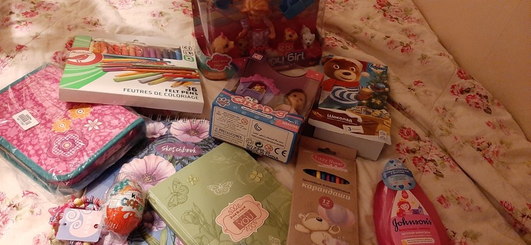Здесь есть все для школы и творчества, заколочки, игрушки и сладости! Дети разобрали все сразу)Большое спасибо за радость, которую дарите детям!