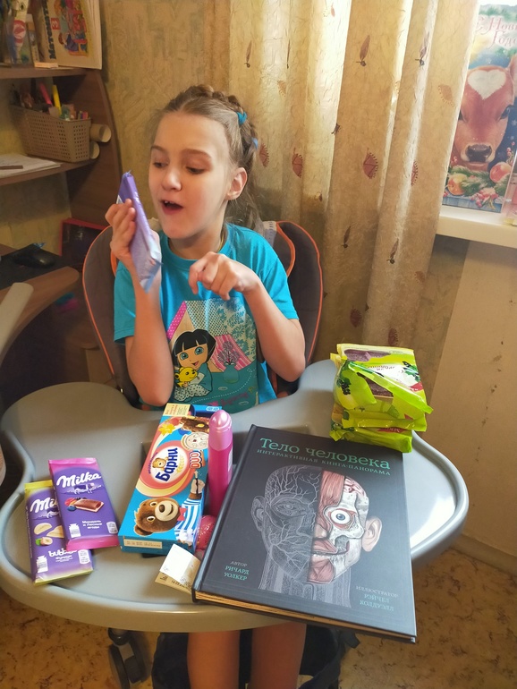 Благодарность фееК Анюте перед Новым Годом прилетала Фея Женя и оставила подарочек, пакет, полный сладостей, которых хватит месяца на 2, девчачий гель для душа и супер умную книгу 3д, анатомию человека, даже я залипла на нее! Аня по традиции потребовала опять внепланово повторно мыться новым гелем, и посмотрев анатомию, удивилась, неужели у нее такой же мозг:)))