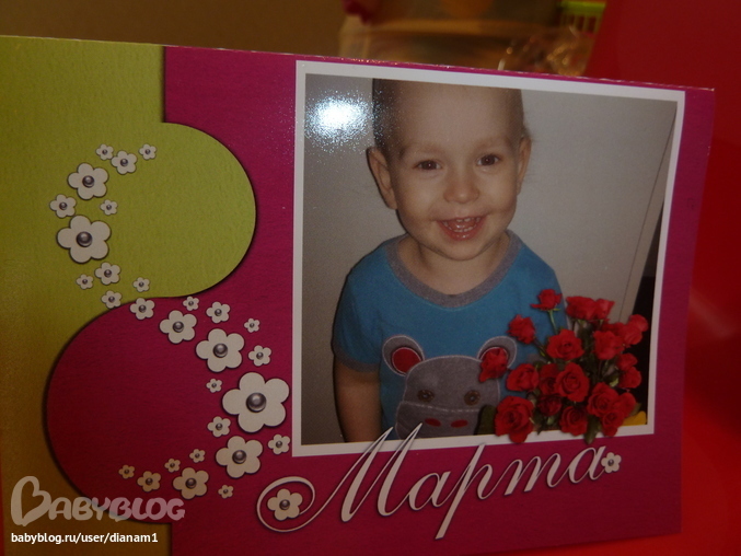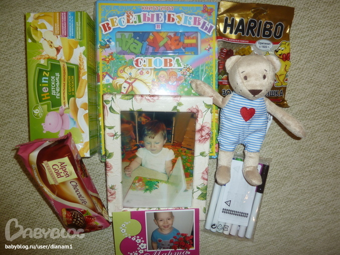 Нам подарили: кучу вкусняшек - печеньки для мамы, для дочки, мармеладки; мягкого Мишку в тельняшке, фломастеры, чудо-буквы (еще не разобрались с ними) и то, что меня вообще удивило. а Аришу порадовало до бесокнечности (не знала, что у нее такая степень самолюбования и себяобожания - увидела, признала себя, целовала и гладила минут 10) - Аришина фотография в прелестной рамочке и удивительная фотооткрытка от Димочки с его фото на обложке и Арининой внутри. СПАСИБО за СУПЕРПОДАРКИ!!!