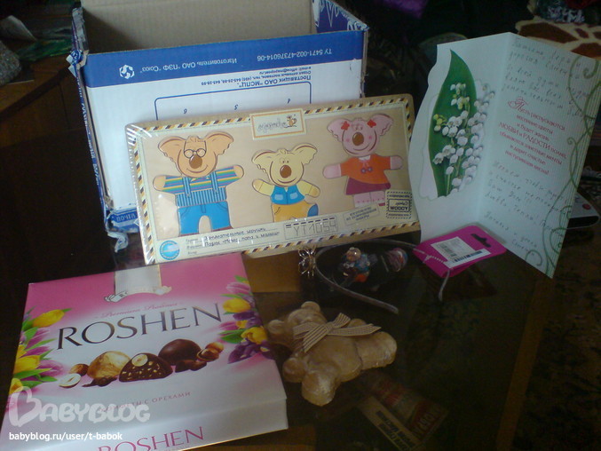 Эту посылочку нам прислала Наташенька с дочей Сонечкой из города Долгопрудный !.............Спасибо огромное Наташеньке за такие чудные подарки! Пазлы мы пока только перебираем, развиваем моторику, я такие даже никогда не видела, ребенок должен составлять одежку для папы мамы и их дитеныша! ...........они так пахнут деревом обнюхаться просто))))) ........на будущее есть чем занять ребенка. Лерка уже на след день одела ободок и пошла хвастать в школу ;) ...........конфеты коненчо не долежали до 8 го)))) ...а мишка - мыло то как пахнет.мммммм положила его среди детских вещей ....жалко мылить его ....пусть послужит подольше. Спасибо Наташеньке и Сонечке за доставленный праздник, и поздравляем в ответ с Наступающим праздником и желаем всего самого хорошего , конечно здоровья и тепла в доме!