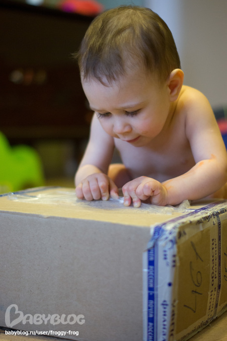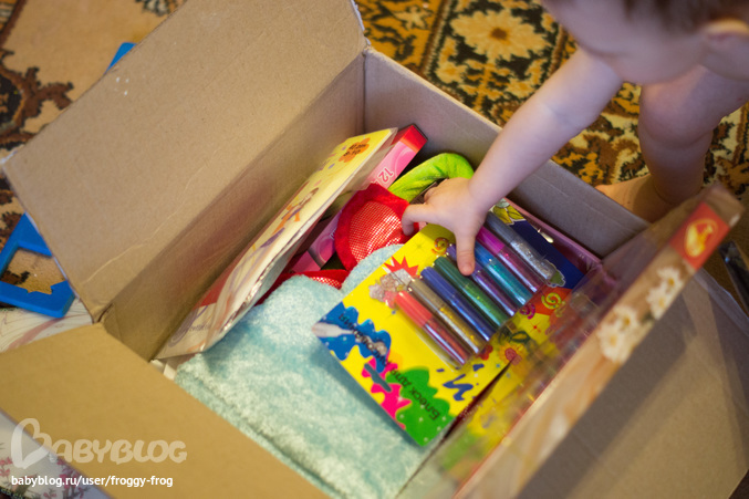 за посылку, которая пришла очень вовремя! С утра, 6 марта, пока папа был дома, я сбегала в местный филиал ада на земле Почты России, и вскоре Анютка вовсю потрошила коробку.
