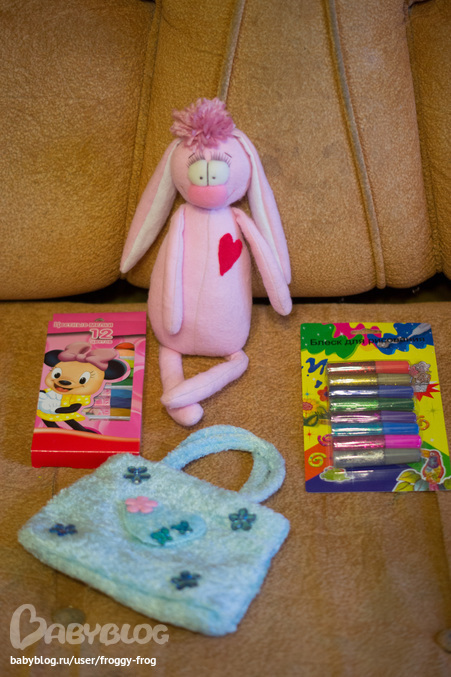 Мелкопупсу досталось не меньше - сумочка, блестки и восковые мелки для рисования и милая зайка. Даже не милая - просто обалденная зайка! С ресничками! Сфотать ребенка с зайкой не вышло - так крепко она ее обнимала, что игрушку видно даже не было )) А уж когда она увидела мелки!