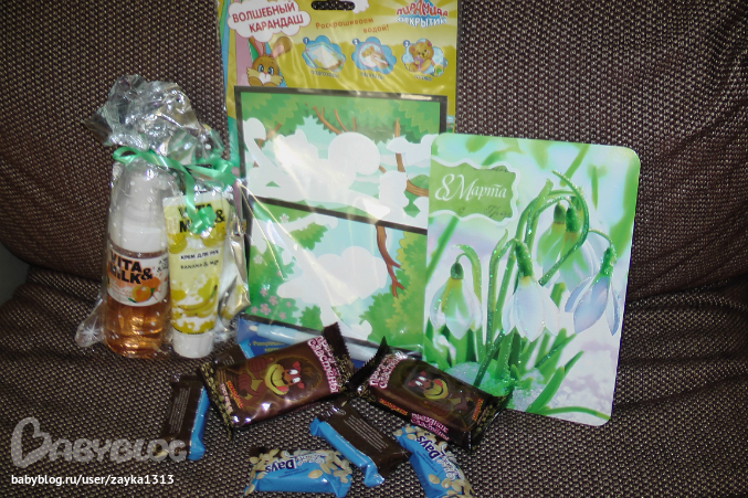 Красивые подснежники)) От меня лично спасибо за банановый(!!!) крем для рук и персиковую пенку, прям слюньки текут от таких вкуснючих запахов))) Конфетки мы с папой попрбовали еще с вечера, очень вкусные)) Понравилась раскраска водой, еще не опробовали, я не видела такую раньше!
